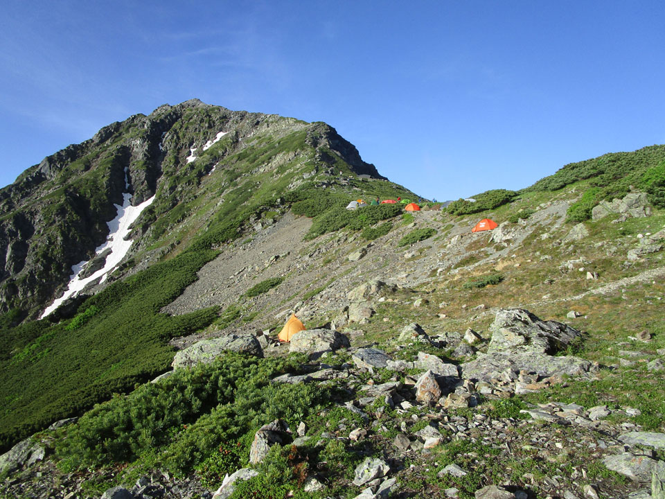 稜線上は広いが、斜めになっている場所が多い。寝心地はやや悪いサイトが多い。