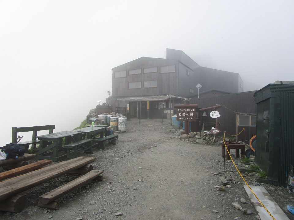 肩ノ小屋のテント場は、北岳山荘ほどではないが広く、100張りくらいはいけそう。