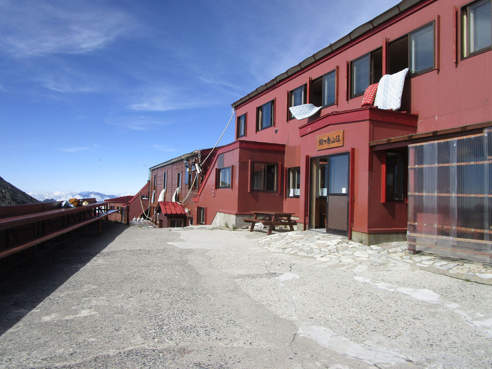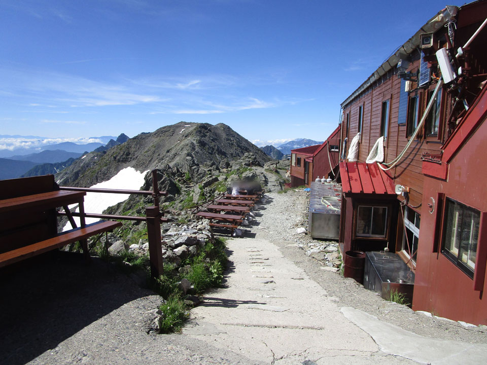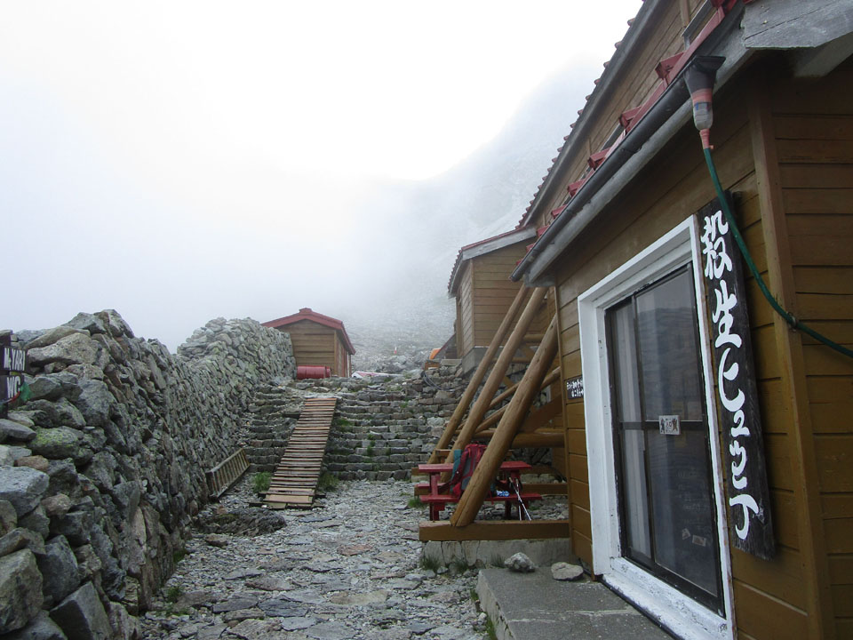 槍ヶ岳山荘の軒先は風雨・日差しが避けられるエリアがあり、ありがたい。