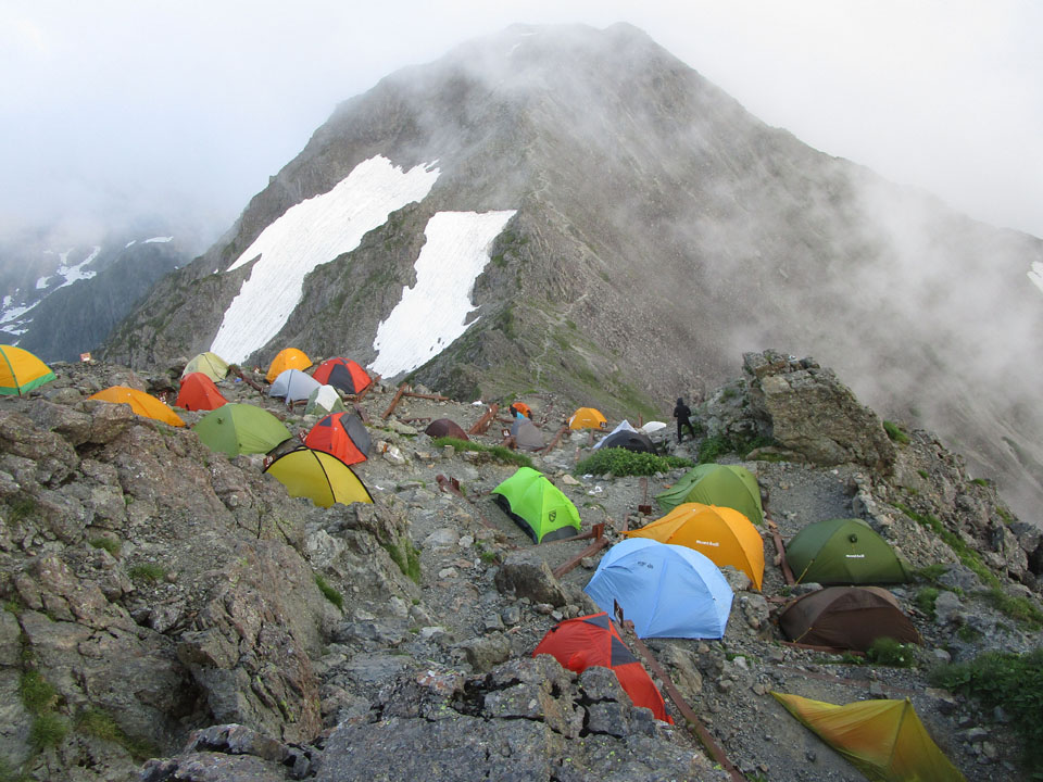 槍ヶ岳山荘テント場は、標高3,070mで日本最高所のテント場である。