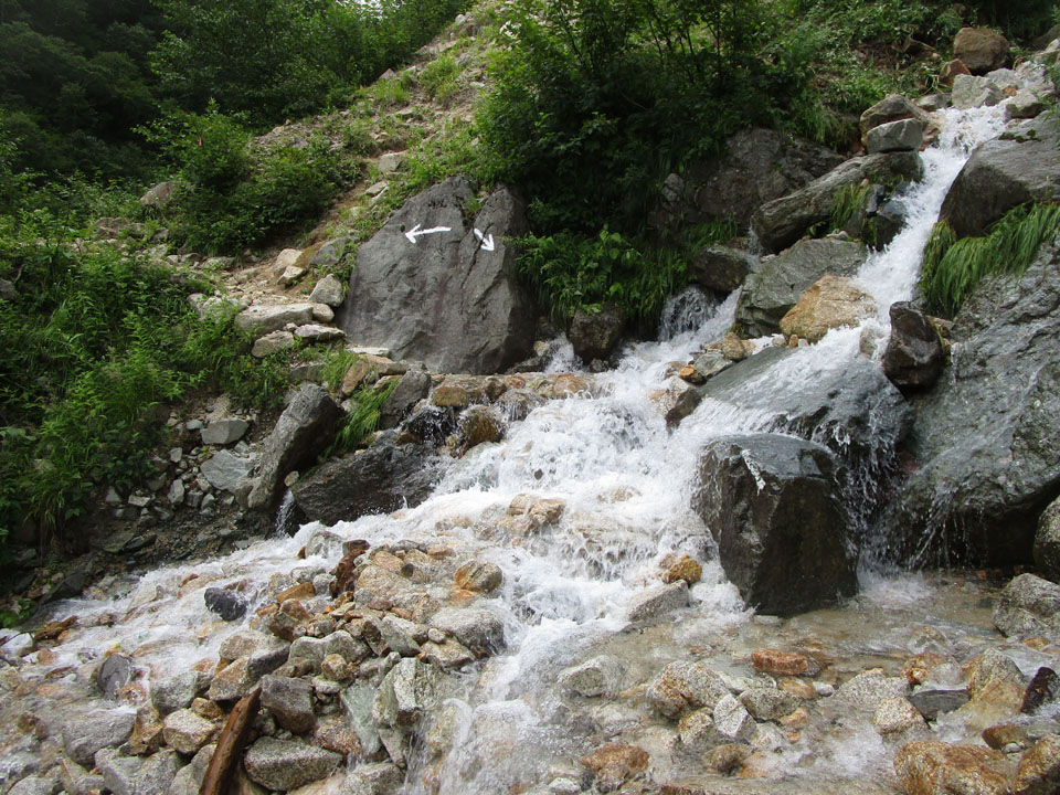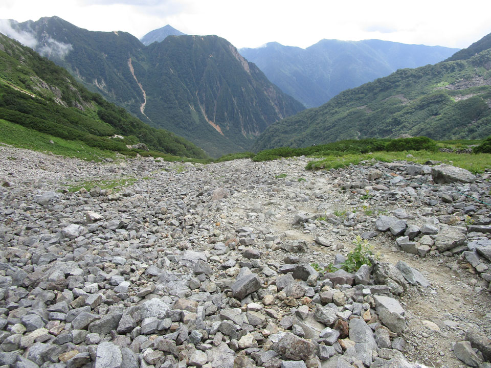 途中、グリーンバンドのヒュッテ大槍の水場が最終水場とのことだ。