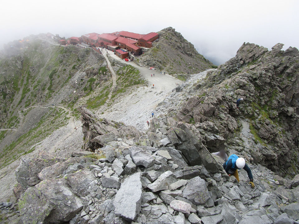 では、槍ヶ岳山荘に降りてきて、ゆっくりと準備をして降りよう。1110に降り始める。