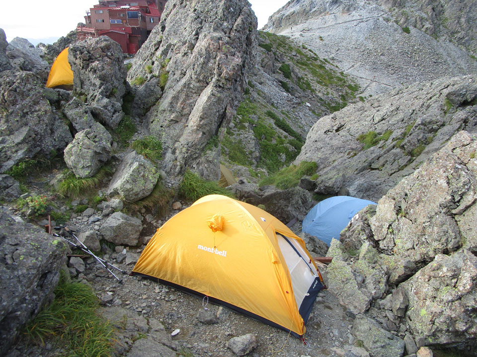 槍ヶ岳山荘テント場は、標高3,070mで日本最高所のテント場である。